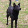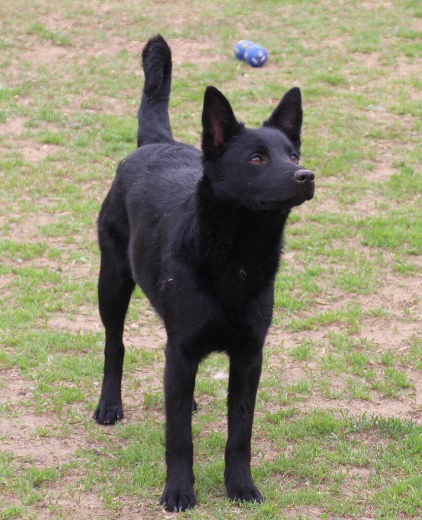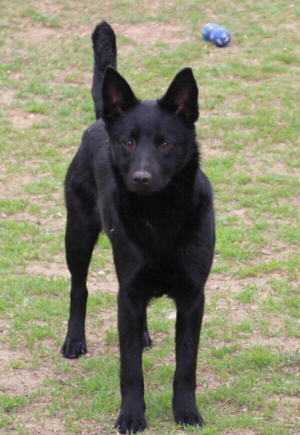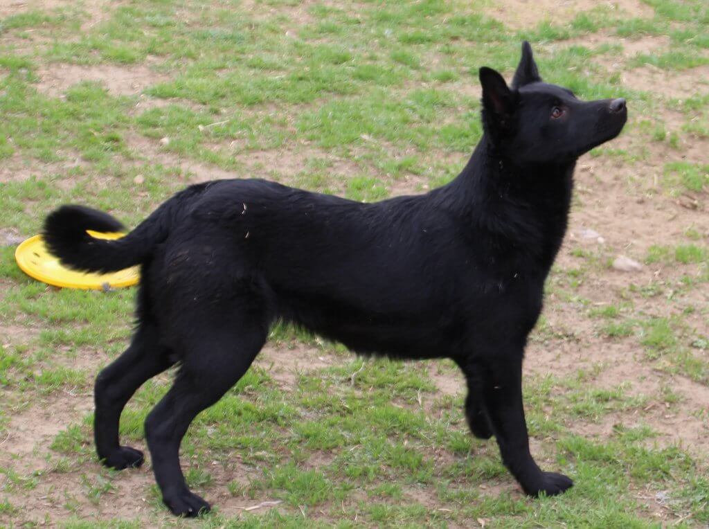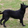 A kutyus szőre csillogó fekete, rövid, fülei magasan tűzöttek, tartása királynői.
